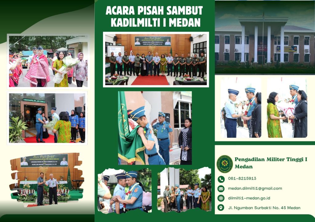 Medan, 10 November 2025 Pengadilan Militer Tinggi I Medan melaksanakan acara pisah-sambut luring maupun daring. Acara pisah-sambut ini merupakan moment melepas Kepala Pengadilan Militer Tinggi I Medan lama Laksamana Pertama TNI Hari Aji Sugianto, SH., MH. dan menyambut Kepala Pengadilan Militer Tinggi I Medan yang baru Kolonel Kum Immanuel Pancasila Simanjuntak, SH., M.Si. Pejabat lama Laksamana Pertama TNI Hari Aji Sugianto, SH., MH. menjadi Kepala Pengadilan Militer Tinggi II Jakarta. Dalam sambutannya, Kadilmilti I Medan lama Laksamana Pertama TNI Hari Aji Sugianto, SH., MH. menyampaikan terima kasih atas kebersamaan dan kerjasama serta dukungan semua pihak dan permohonan maaf baik secara pribadi maupun sebagai Kadilmilti bila ada kekurangan dalam masa kepemimpinan. Kadilmilti I Medan yang baru, Kolonel Kum Immanuel Pancasila Simanjuntak, SH., M.Si. menyampaikan terima kasih dan meminta dukungan segenap personil dan seluruh jajaran yang berada dibawah Dilmilti I Medan dalam menjalankan tugasnya kedepan demi Peradilan Militer yang lebih baik.