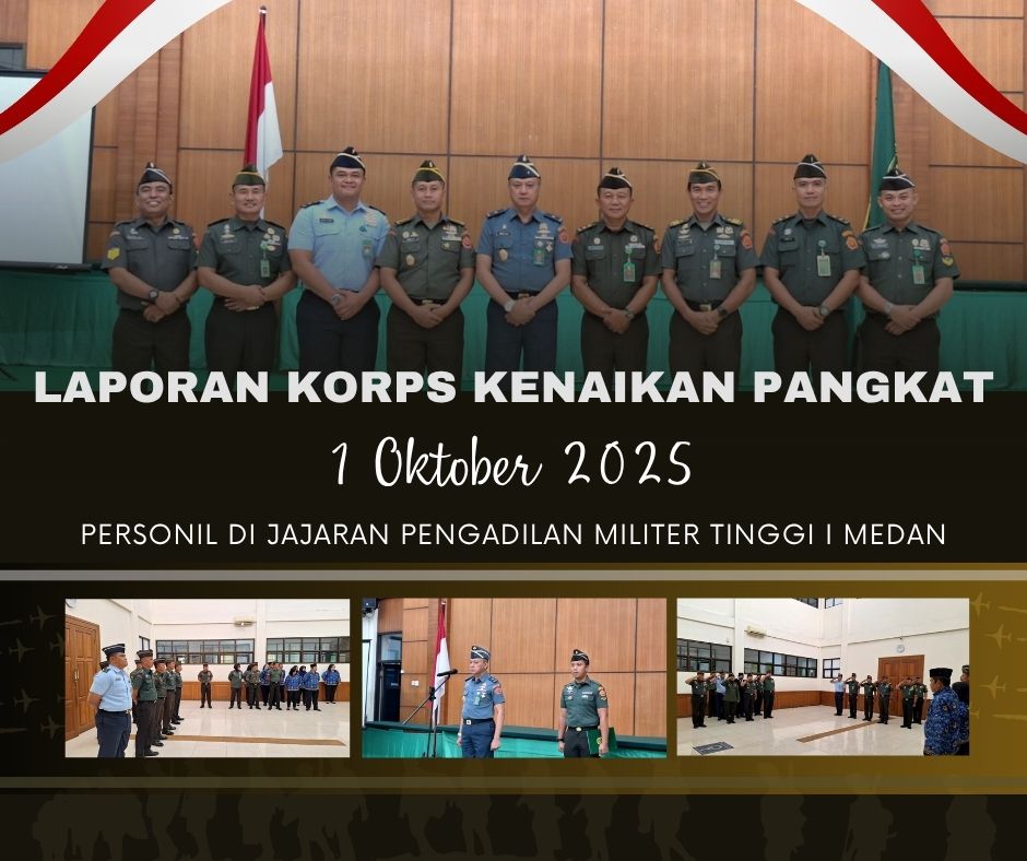 Medan, 1 Oktober 2025 Kepala Pengadilan Militer Tinggi I Medan Laksamana Pertama TNI hari Aji Sugianto, SH,. MH. sebagai Pimpinan Acara Laporan Korps Kenaikan Pangkat Periode 1 Oktober 2025 yaitu Mayor Kum Ronal S. Hamonangan Sinaga Anggpokimmil Dilmil I-02 Medan, Mayor Chk PF.Simamora, SH., MH. Panitera Pengganti Dilmilti I Medan, Kapten Chk Miyas, SH., MH. Panmud Pidana Dilmil I-02 Medan, Kapten Chk Ungsi Horas Manik, SH. Panmud Pidana Dilmil I-07 Pontianak. Pelda Arif Siagian Pengelola Dekumentasi dan Informasi, Serma Ramlan, SH., Pengelola Penanganan Perkara Dilmilti I Medan, Serda Dede S. Siregar, SH., Pengandministrasi Perkantoran Dilmil I-02 Medan. Laporan Korps Kenaikan Pangkat ini diikuti juga oleh Hakim Tinggi, Kadilmil I-02 Medan, Pejabat Struktural dan Fungsioanal Dilmilti I Medan dan Dilmil I-02 Medan.